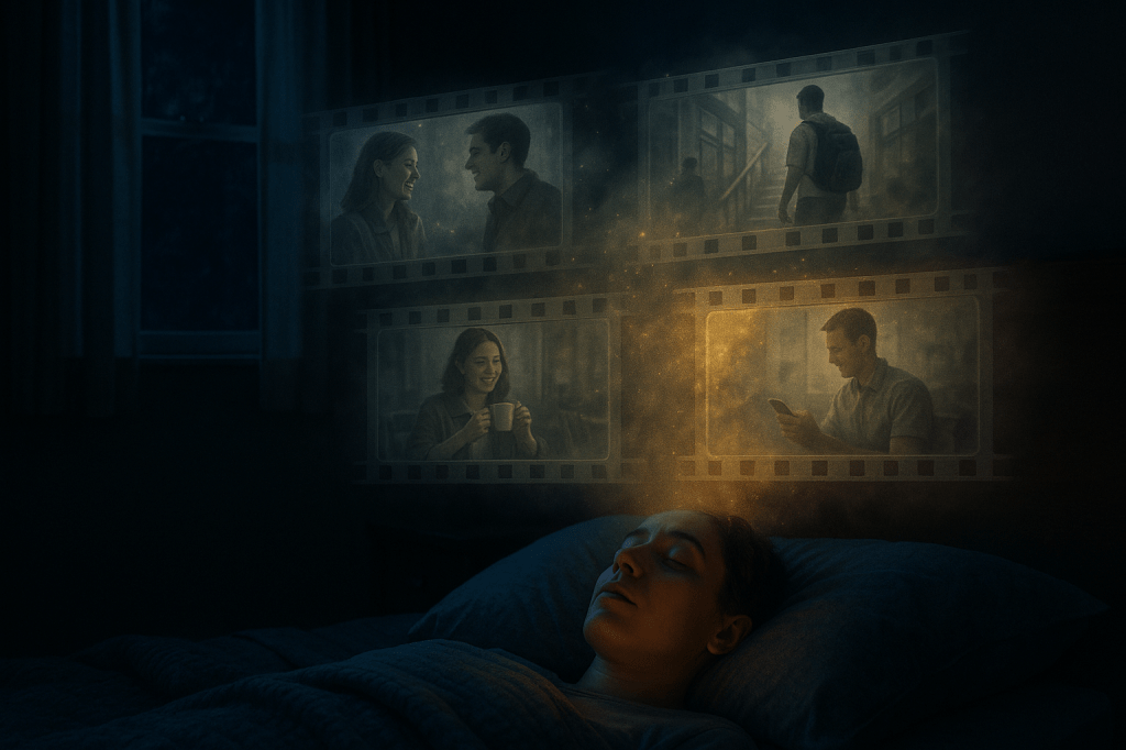 He meant that you go back through your day – mentally, lying in bed before you fall asleep – and you re-imagine it. You pick the moments that didn’t go well. The awkward conversation. The thing you wish you’d said differently. The email that landed wrong. And you replay them, scene by scene, but you change what happened. You imagine it going the way you wanted. And then you fall asleep inside that revised version.