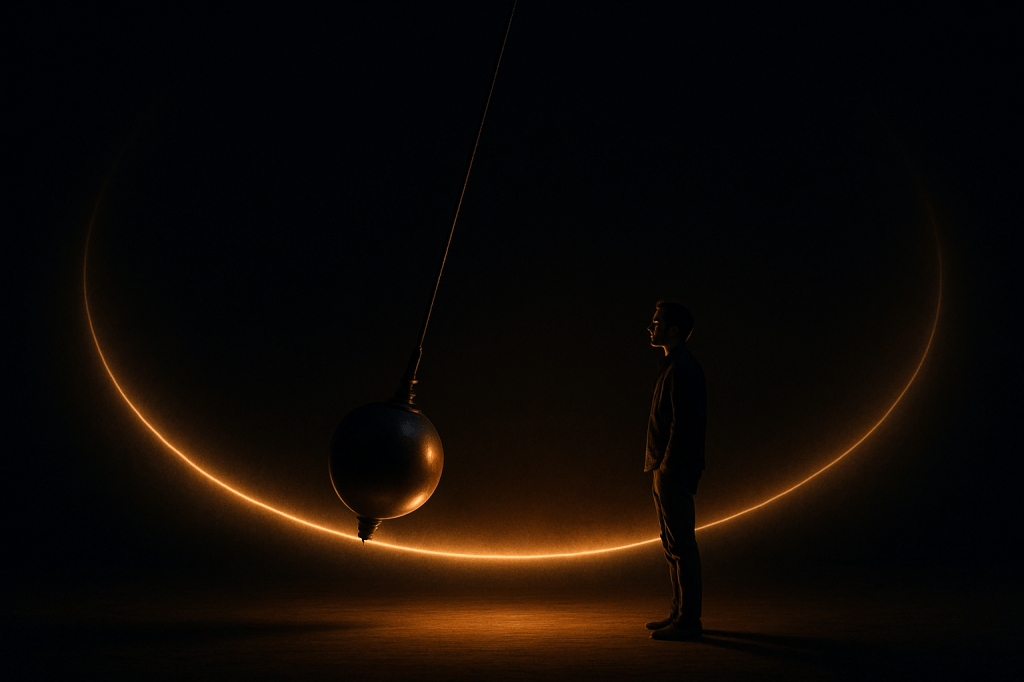 The Kybalion describes something I’d never considered: a midpoint. A neutral place between the swings. Not good, not bad. Just stillness. A center point the pendulum passes through on its way up and on its way down.